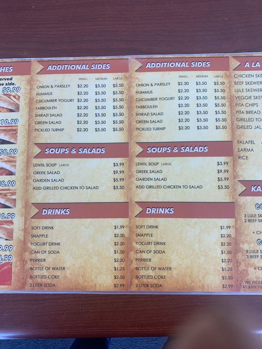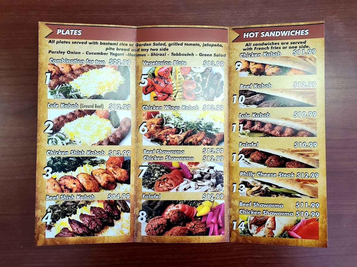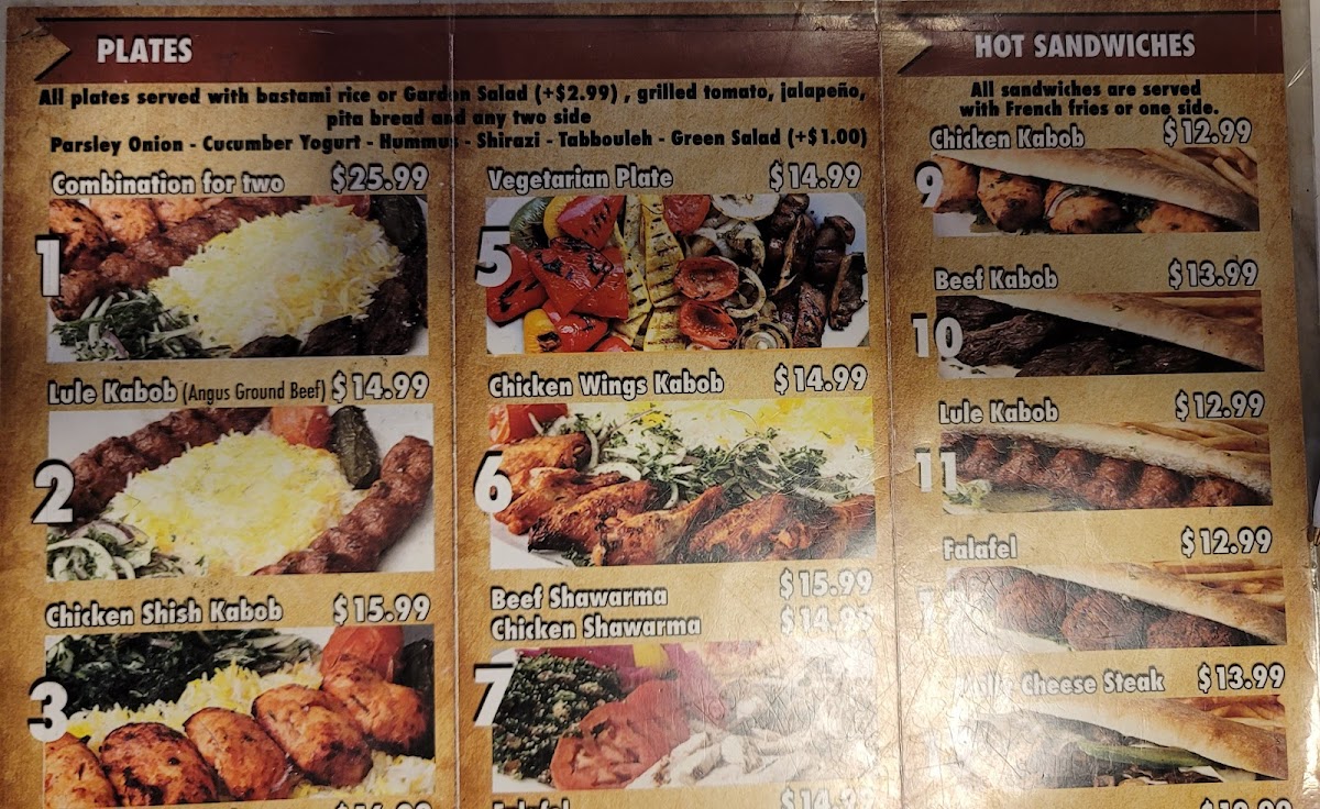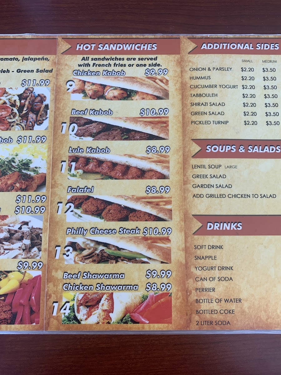 Hot Sandwiches: The hot sandwich offerings include a variety of kabob sandwiches such as Chicken Kabob, Beef Kabab, and Lule Kabob. Additional options include Falafel Sandwich and Shawarma Wrap served with pita bread, hummus, pickles, and tahini sauce. A non-Mediterranean option like the Philly Cheese Steak Sandwich is also available.